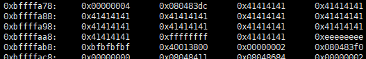 buffer의 시작주소는 0xbffffa90, "AAAA"의 주소는 0xbffffac0 이네요.