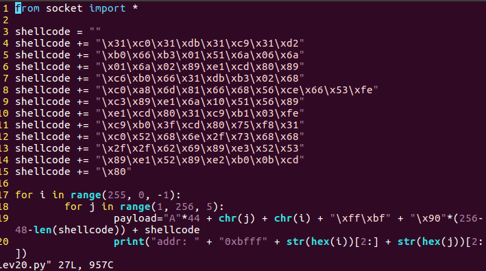 아래의 for문에서는 0xbfff0000부터 0xbfffffff까지 brute force공격(무차별 대입)의 역할을 수행합니다.